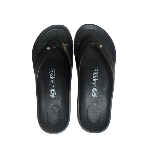 A pair of black orthotic Arch Support Thongs made of EVA foam, displayed against a white background.